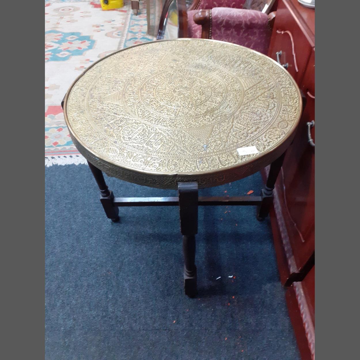 A TWIN-USE Indian brass table inscribed with Arabic script and 'flip-over' as a green velvet card table, quite unique, - diameter 60cm approx - height 63cm approx with folding wooden support legs