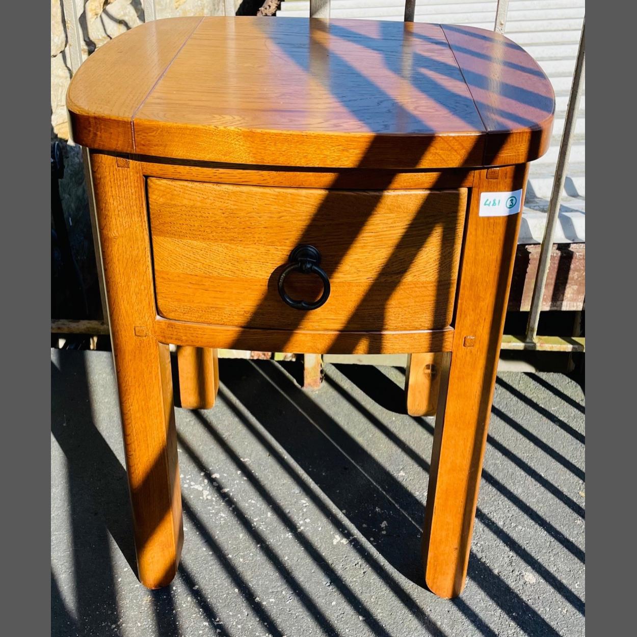 A nice heavy oak style oak side table with drawer - dimensions 45cm square top x 56cm height approx