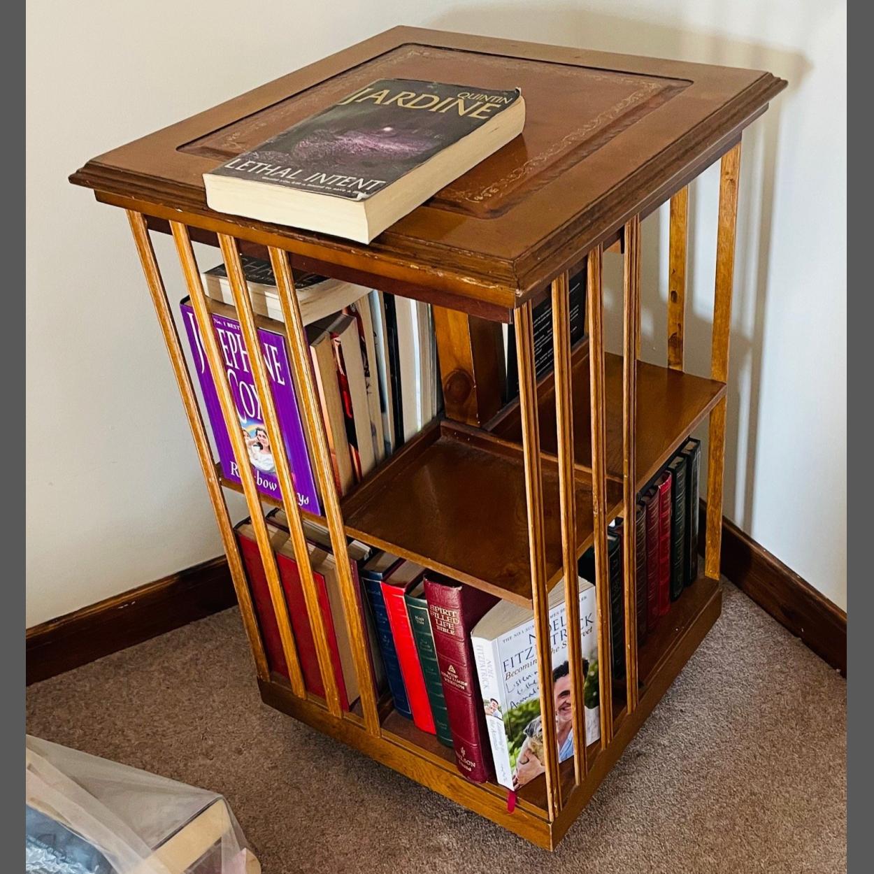 A QUALITY EDWARDIAN inspired revolving bookcase with a brown leather feature top - dimensions (books not included) 47cm square top x 77cm height approx