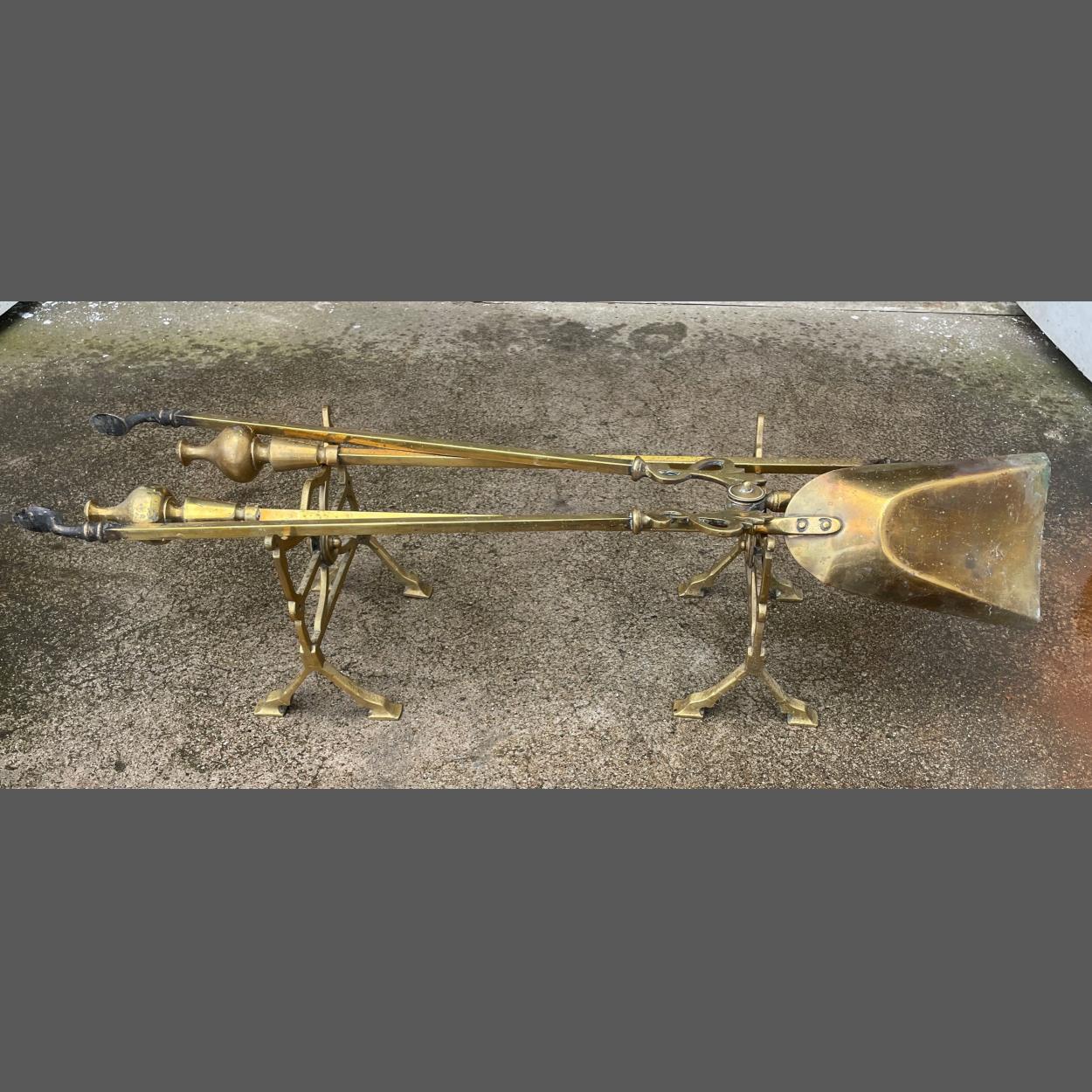 A set of fire dogs with long brass irons set to include a shovel, poker and tongs
