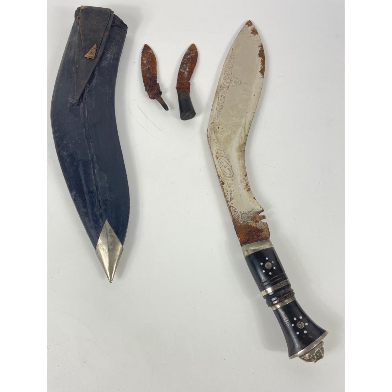 A traditional KHUKRI knife with 2 small daggers in a leather scabbard, each piece is rusted