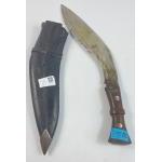 A wooden-handled KHUKRI knife in a leather scabbard, blase approx 30cm long