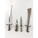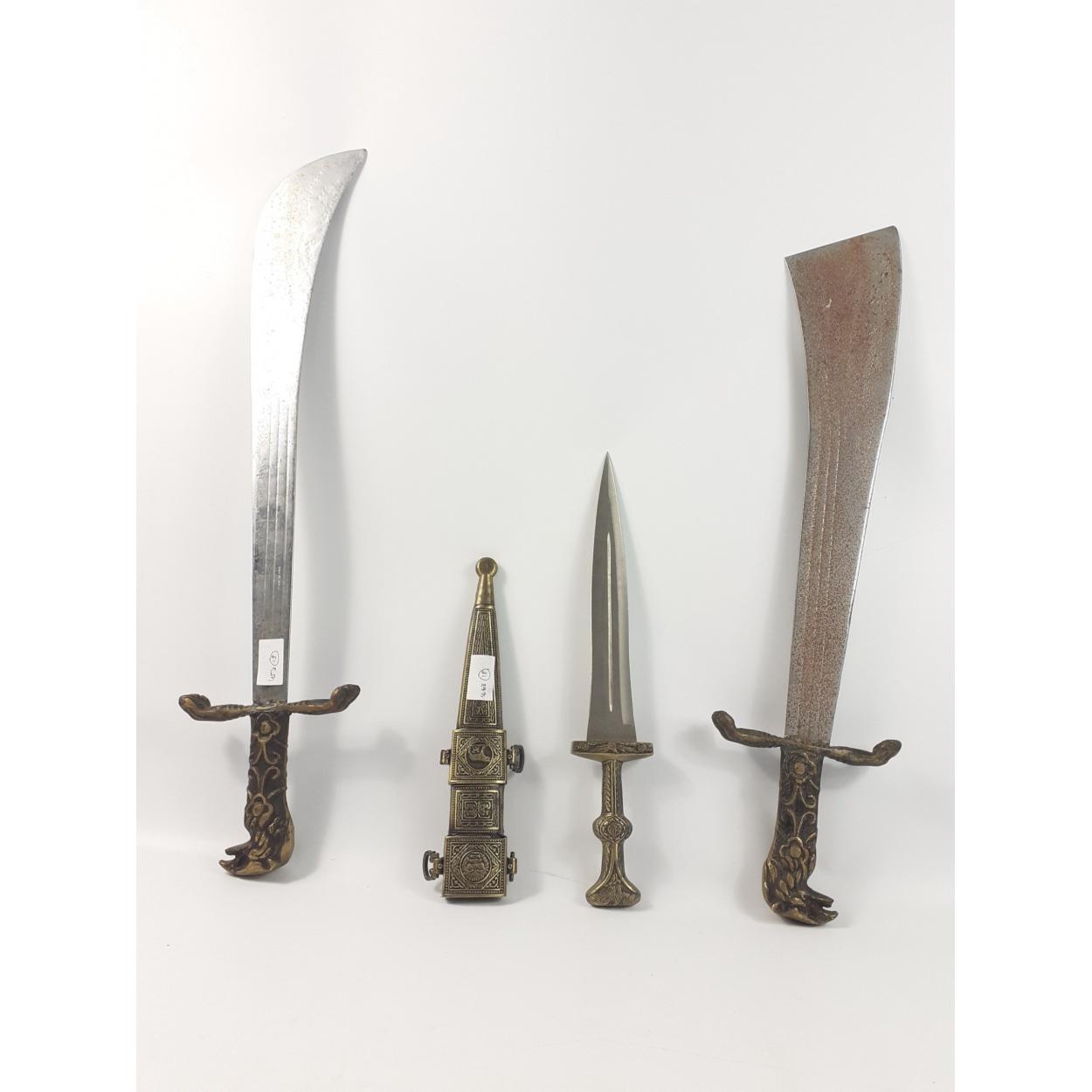 TWO MACHETES with handle detail of feet and eagles as well as a sword in an exquisitely detailed case with lion and cat Dimensions - Two machetes 59cm and 65cm and sword 40.8cm. Good condition, LOVELY PATINA!
