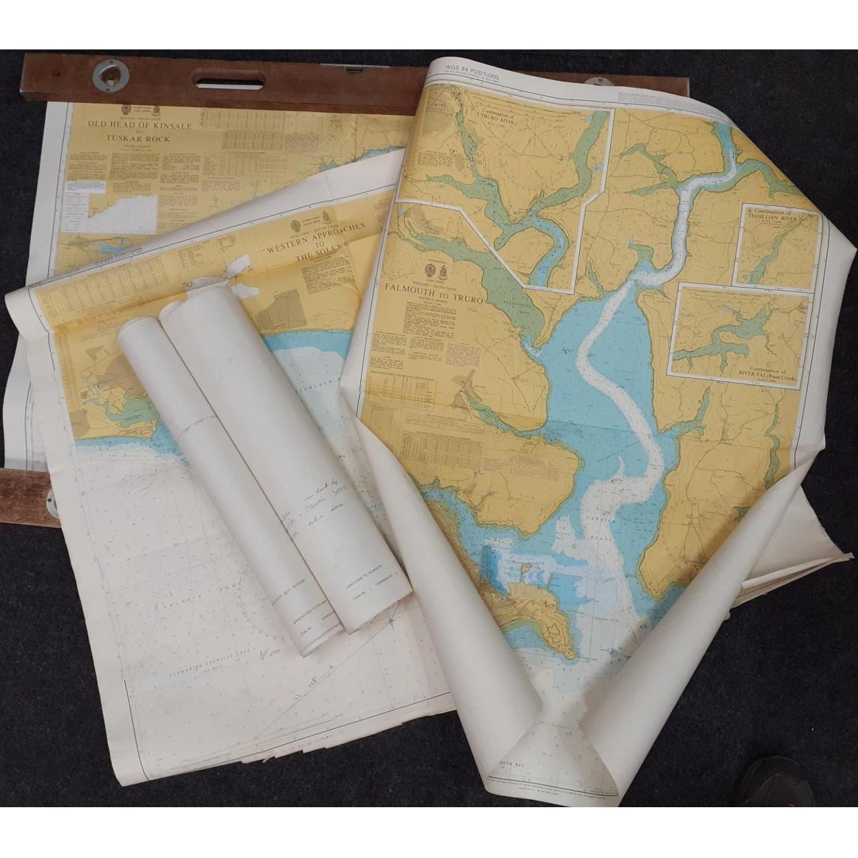 A collection of nautical charts to include Approaches to the Wash, Great Yarmouth and Approaches, River Tees to Scarborough, Land's End to Falmouth, Falmouth to Truro and others