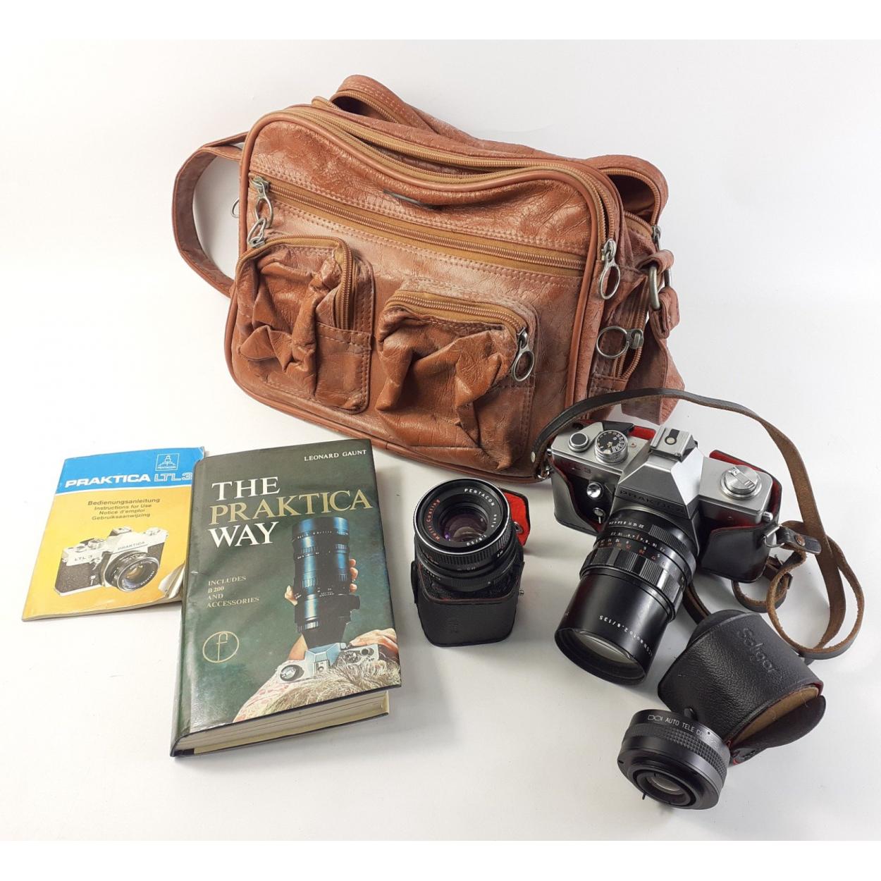 PRAKTICA LTL-3 camera body with Pentacon auto 2.8 / 135 lens. In older bag with Pentacon 1.8/50 lens and a Pentax DCI tele converter. All appear to be in good clean condition.