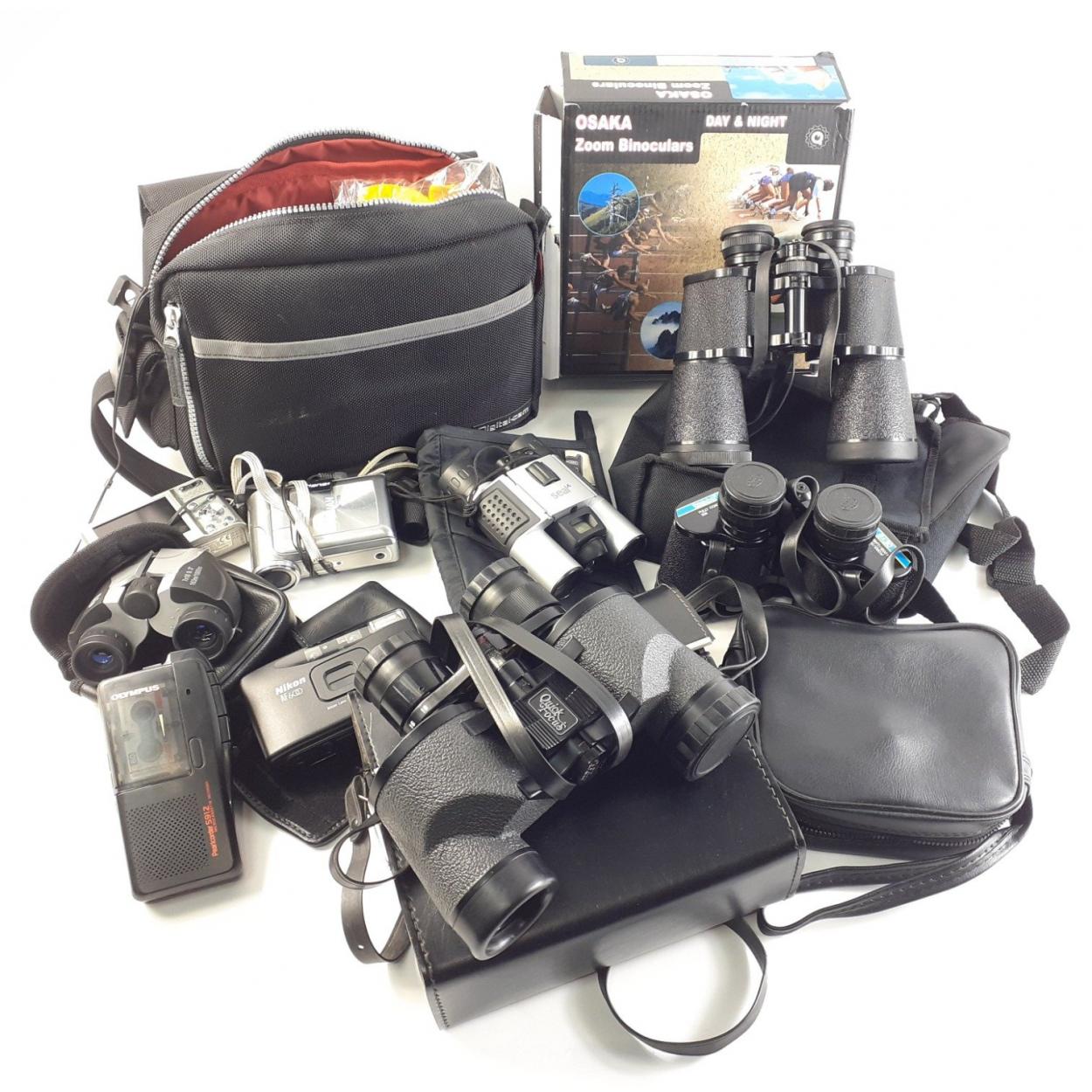A small photographic and optical lot to include TOSHIBA, CAMILEO, FUGI Fine Pics, FUJI digital camera. A pair of JESSOP binoculars (AF), and a pair of FALCON zoom binoculars and 2 others