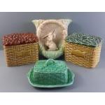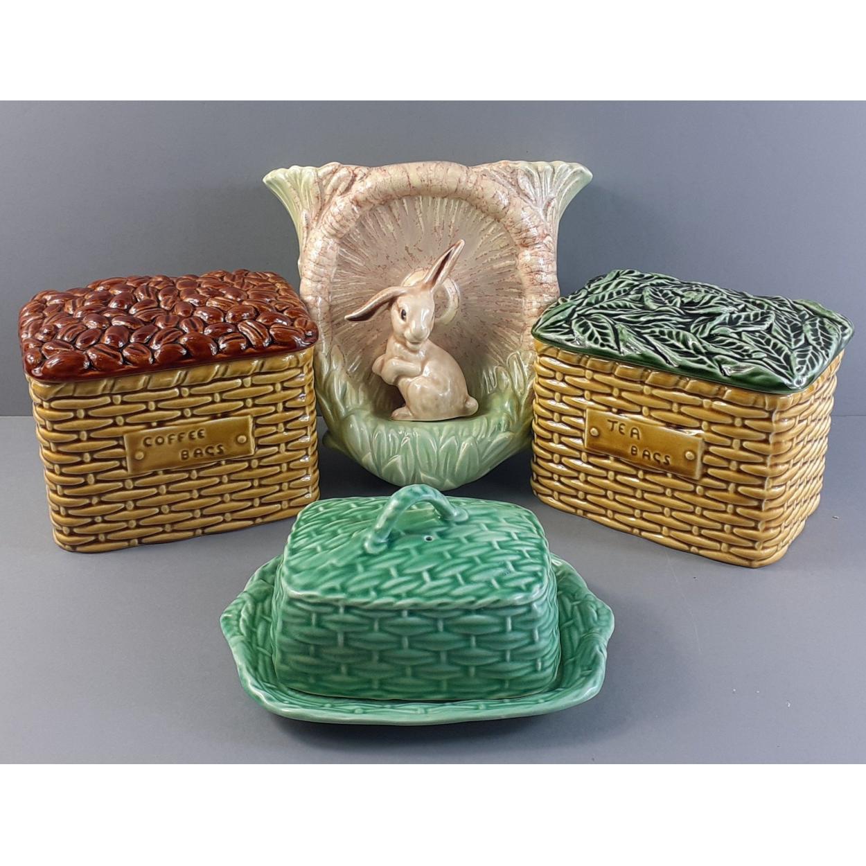 A green SYLVAC basketweave butter dish (3010), base 18cm approx, a SYLVAC tea bag holder (5038) and a SYLVAC coffee holder (5041), a SYLVAC wall-mounted flower vase (323), approx 20cm high. All without damage