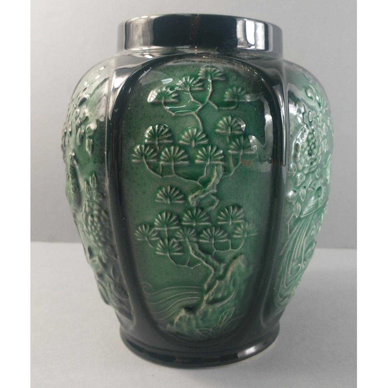 A vintage WADE squirrel and acorn relief jug standing 21cm approx, a BESWICK olive green mantel planter by James Hayward standing approx 14cm tall and a green floral planter (chip in rim) stands 16cm tall approx