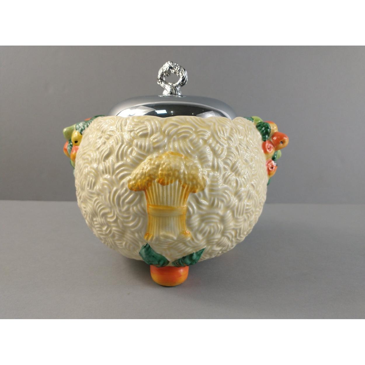 A VINTAGE CLARICE CLIFF Celtic Harvest biscuit barrel with chrome lid, 18cm dia, height 15cm tall. No damage