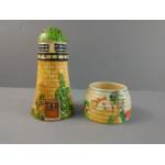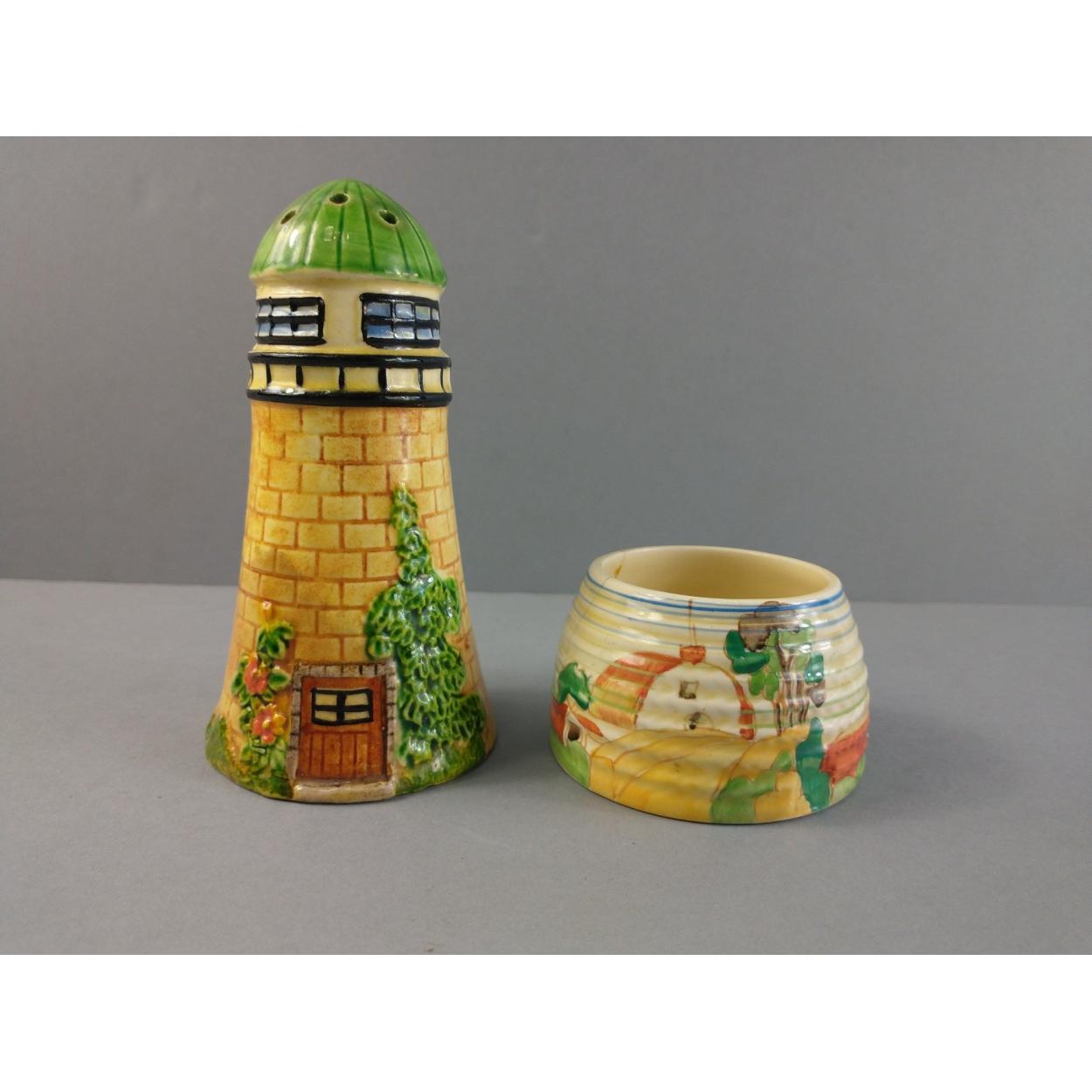 A small CLARICE CLIFF pot with historical crack (8cm at base) and also a vintage MAHURON WARE lighthouse pepperpot (13cm tall)