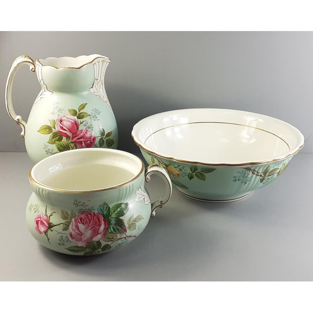 A large JOHN EDWARDS 1880-1881 with hand painted roses and transfer three piece jug, ewer and chamber pot - dimensions of bowl 38cm diameter, 13cm height, jug height 27cm and the chamber pot 20cm diameter x 14cm height approx