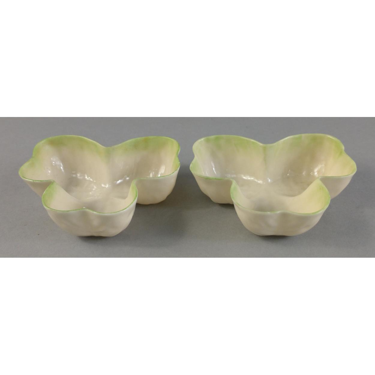 Two early BELEEK black stamped clover shaped dishes each 9cm approx