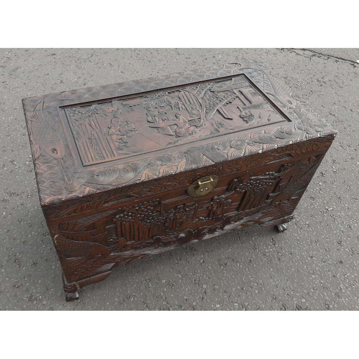 A wooden campaign chest, with beautifully detailed Oriental carving, measures W100 x D54 x H60cm approx