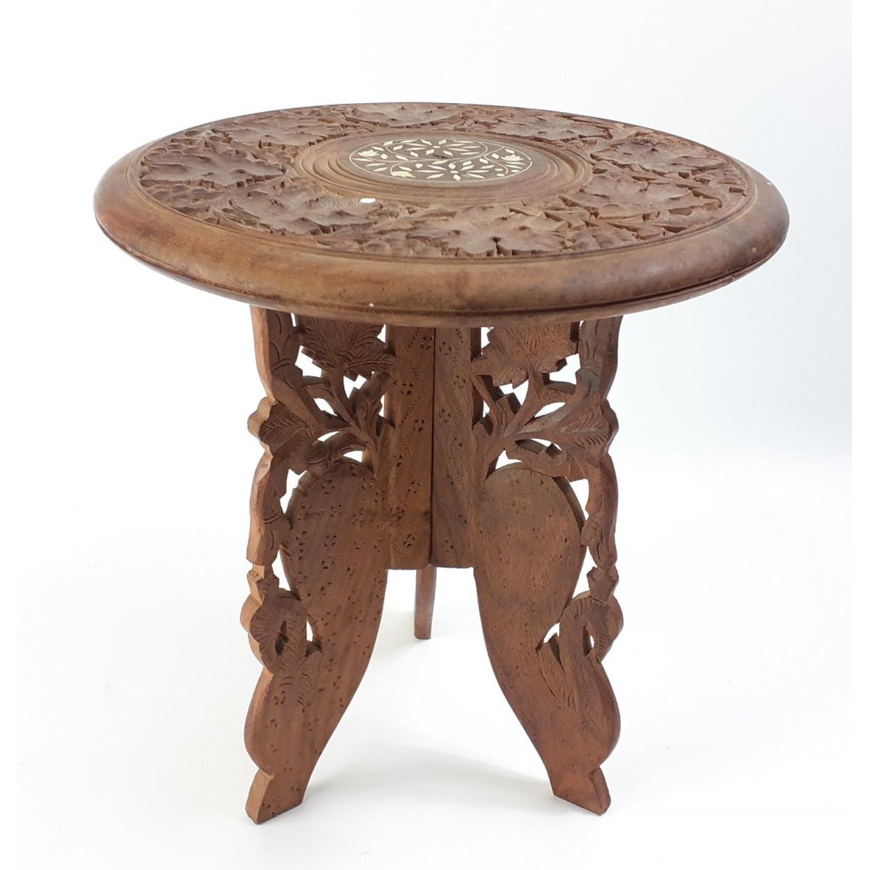 A carved and inlaid Indian wooden 3-legged folding stool standing 32cm high approx.