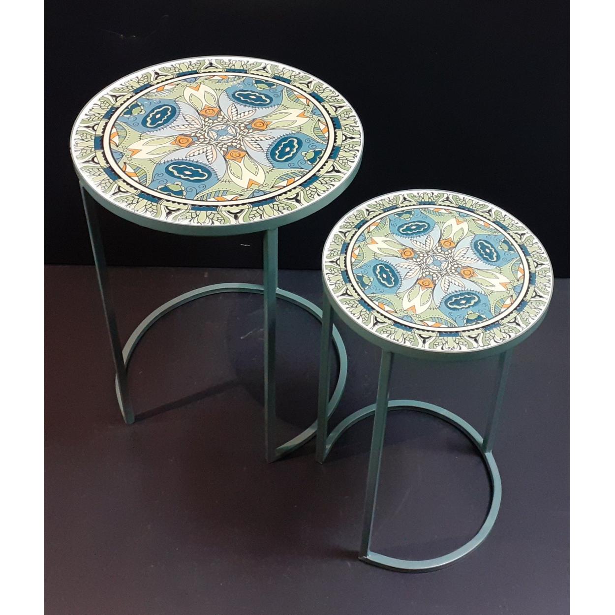 A pair of nested floral ceramic topped conservatory tables, the larger 54cm high