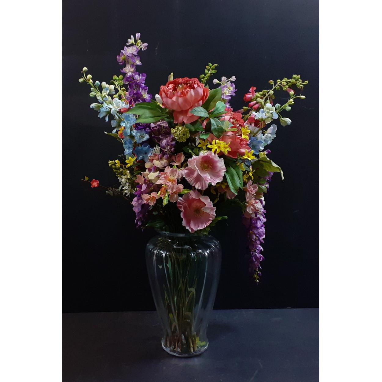 A wonderful large 39cm fluted urn shaped tall glass vase stuffed with quality silk flowers. An impressive and beautiful piece.