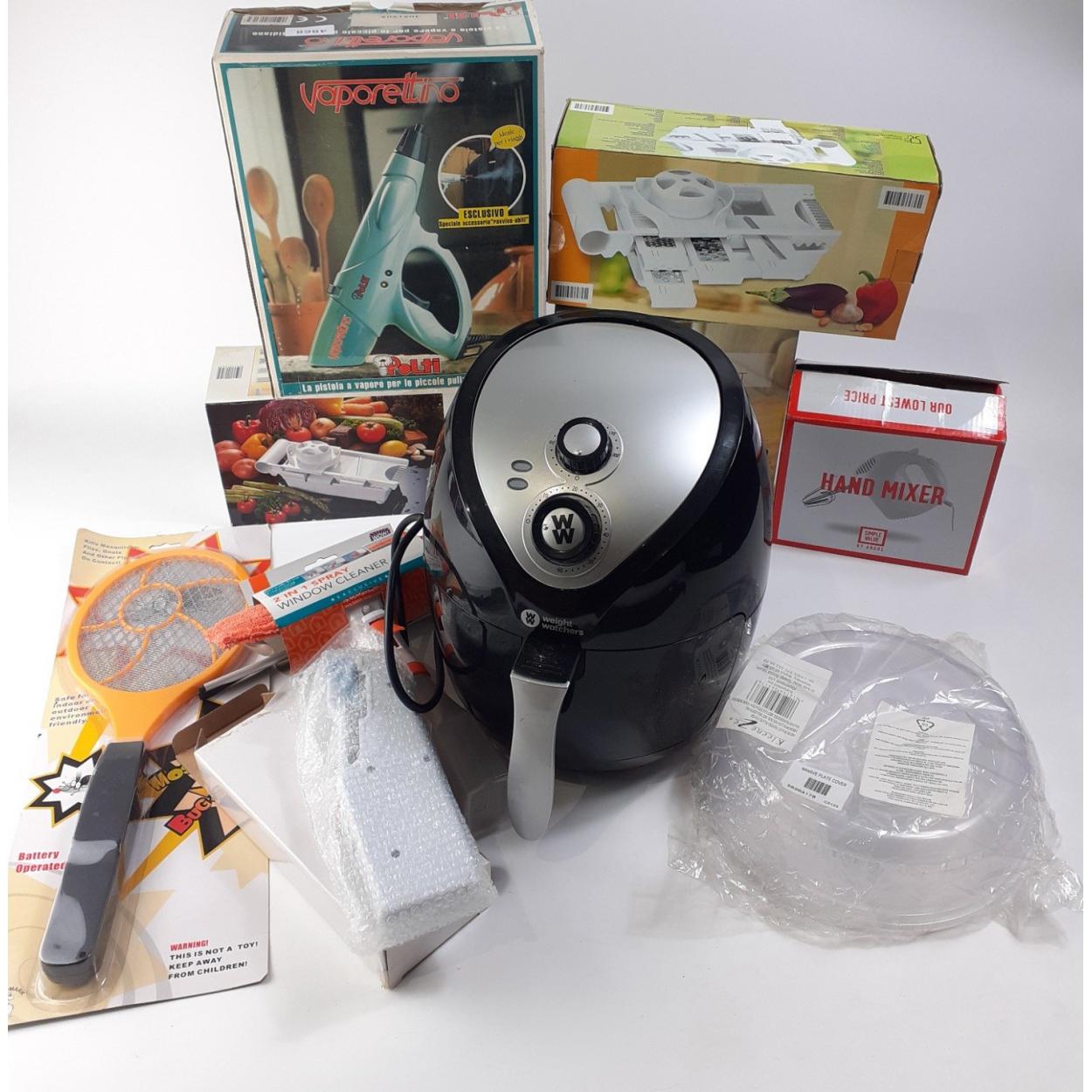 A mixed box of kitchenalia to include a WEIGHTWATCHERS air fryer, VAPARETTO steam cleaner, COMBI grater, hand mixer, mosquito swatter and others