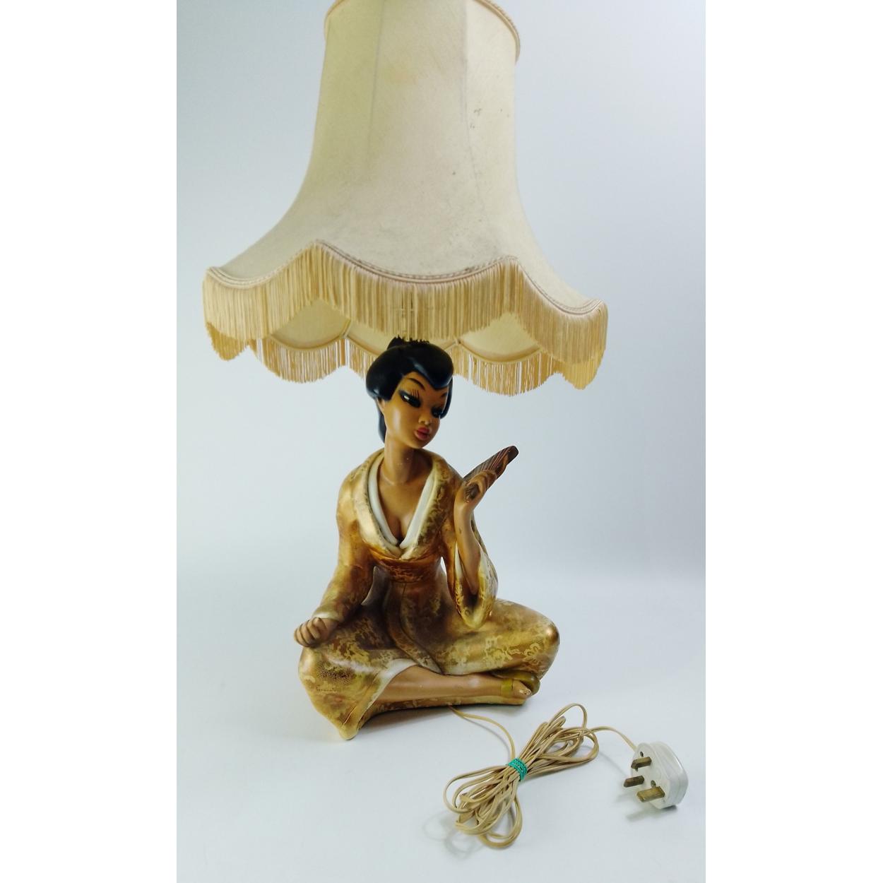 A resin Oriental table lamp (Reg 91064L) with a figure of a lady. Stands 40cm high not inc. shade