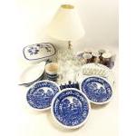 A mixed box to include various mugs, blue and white china, a table lamp, wine glasses, 2 gratin dishes etc