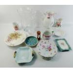 A box of mixed ceramics plus a large glass vase 25cm tall, and a large glass jug