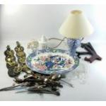 A mixed box comprising a collection of horse brasses, plate display stands, a blue and white table lamp and a large platter decorated with birds of paradise (46cm length)