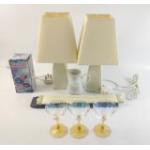 A mixed lot to include a pair of cream bedside table lamps 32cm, a cased slide rule, drill bit sharpener, three pretty glasses and a cream jug.
