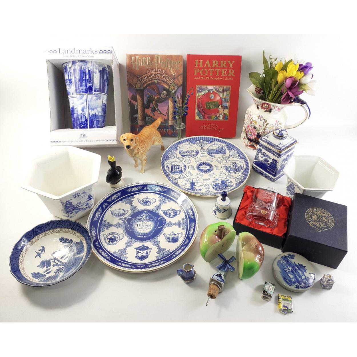 An interesting mixed lot to include a MASON'S jug, RINGTONS vase, decorative ceramic and other pieces as well as two hardback Harry Potter volumes.
