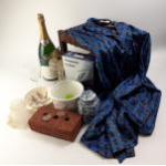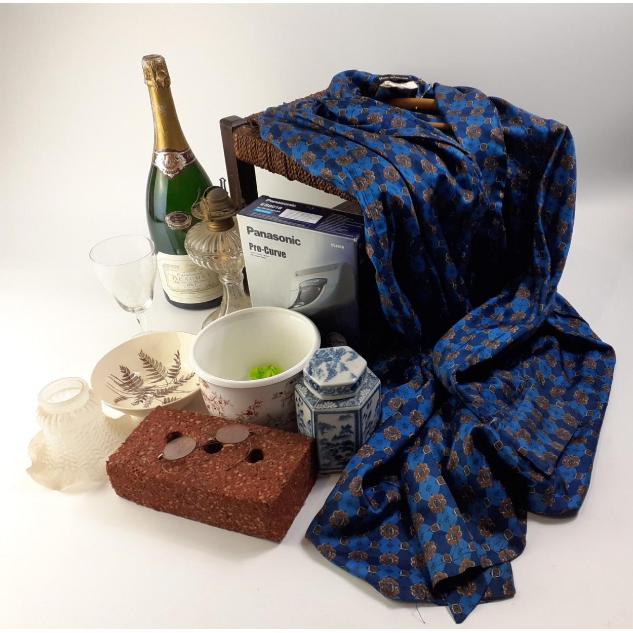 A mixed box to include a man's Nomad dressing gown, a boxed Panasonic Pro-Curve re-chargeable cordless shaver, a ginger jar, an empty magnum champagne bottle, a Coalport planter, a Royal Victoria wild country bowl a footstool and others