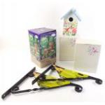 A small mixed lot to include 2 pretty nesting bird boxes, a box of 22mm x 10m fruit netting and 2 hanging basket brackets