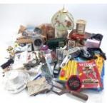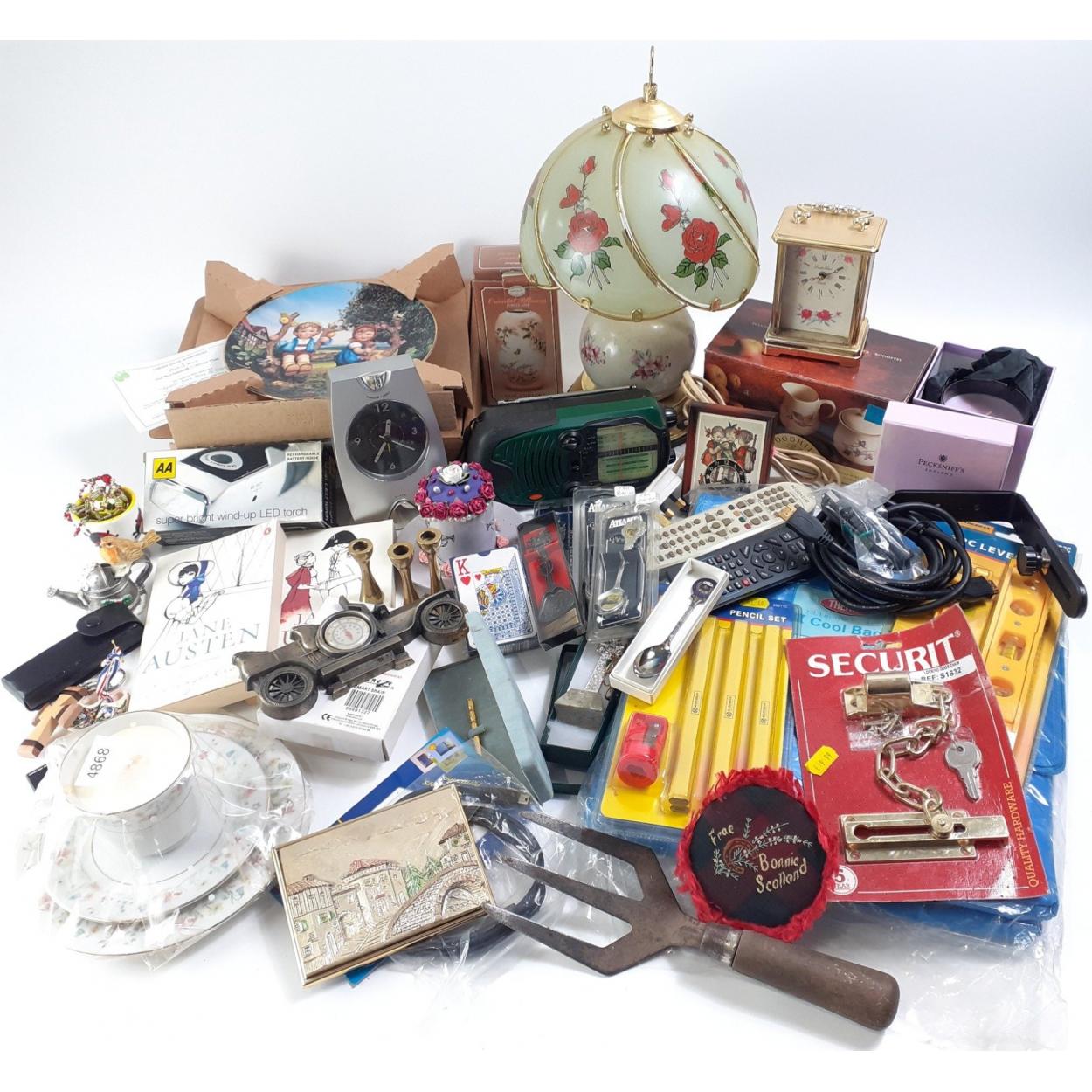 A mixed lot to include a cool bag, security chains, hand-held tools, a wind-up radio, candles, cups collectable decorative spoons, Hummel clock, and others