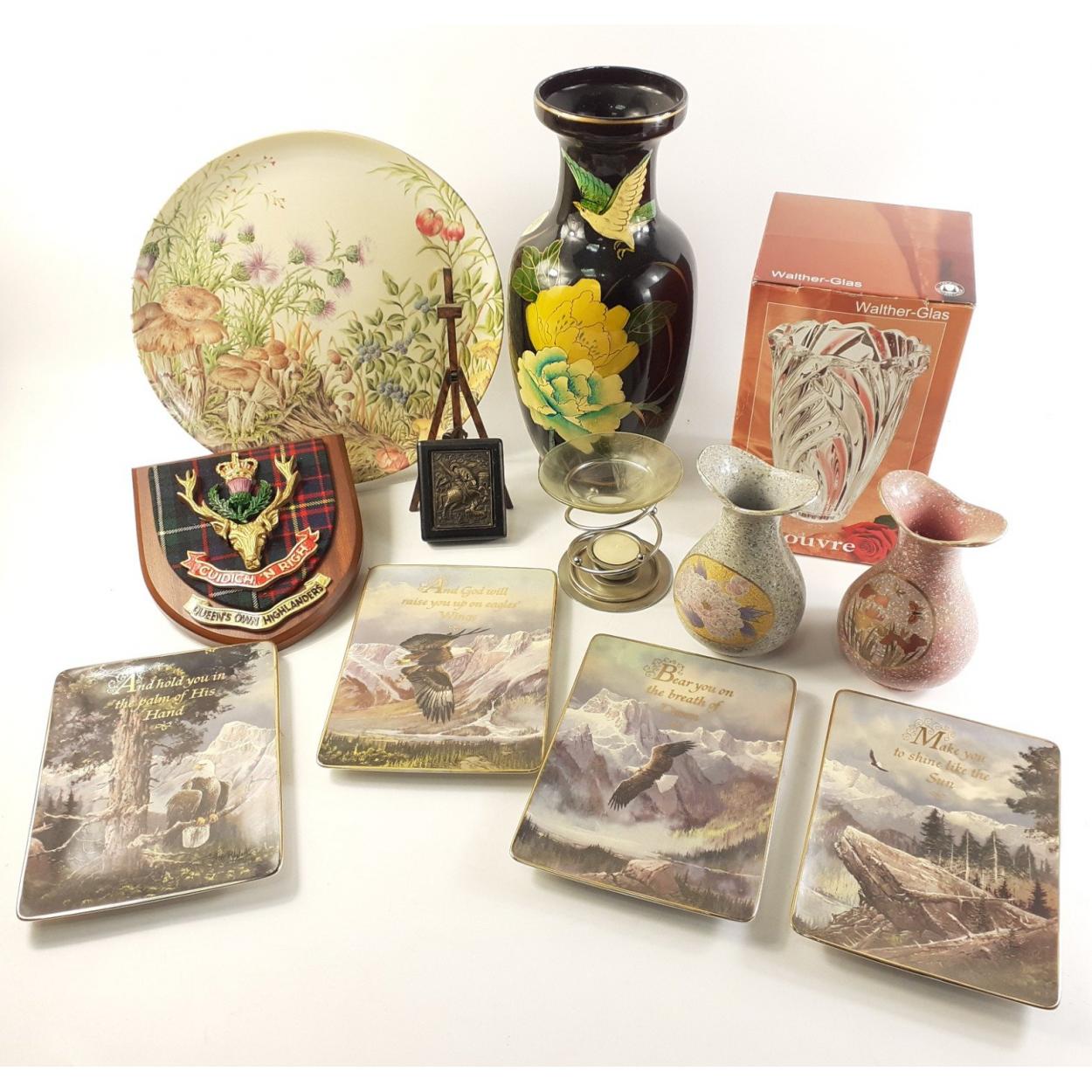 A mixed box to include a WALTER-GLAS vase, an Italian melamine tray, 2 pretty small stoneware vases, ceramic trays, decorative clan crest, candleholder,