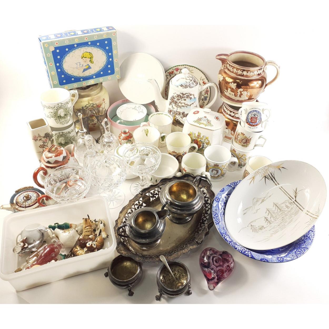 A mixed box to include a Grindley teapot, selection of small ceramic animals, vintage biscuit barrel, copper lustre vases, plates, and other assorted useful ceramics