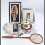 A mixed box to include a 4-in-1 TV remote control, a framed RENNIE MACKINTOSH rose frame 35x30cm approx, a crayon drawing of a feather, a squash racquet and various ceramics.