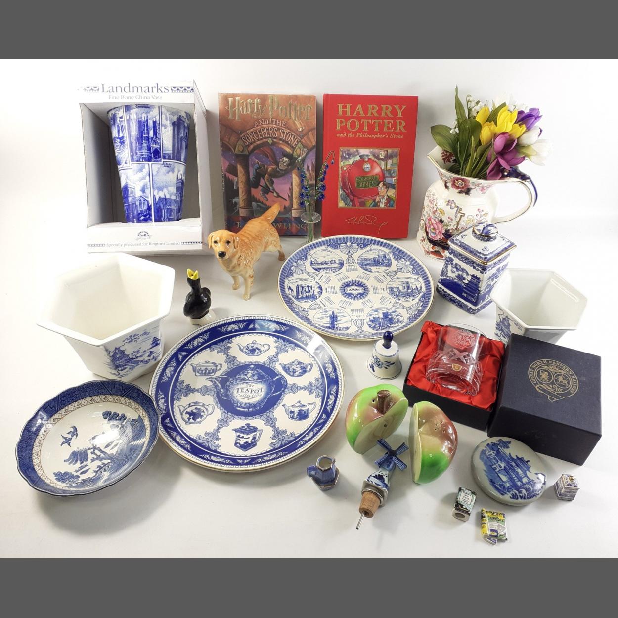 An interesting mixed lot to include a MASON'S jug, RINGTONS vase, decorative ceramic and other pieces as well as two hardback Harry Potter volumes.