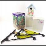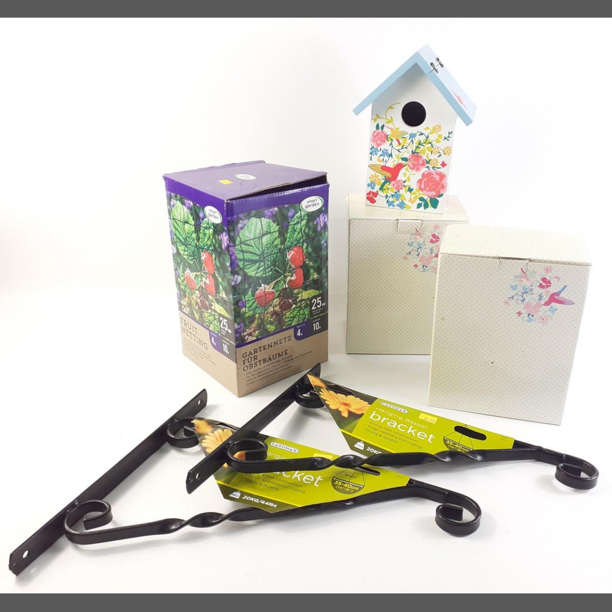 A small mixed lot to include 2 pretty nesting bird boxes, a box of 22mm x 10m fruit netting and 2 hanging basket brackets