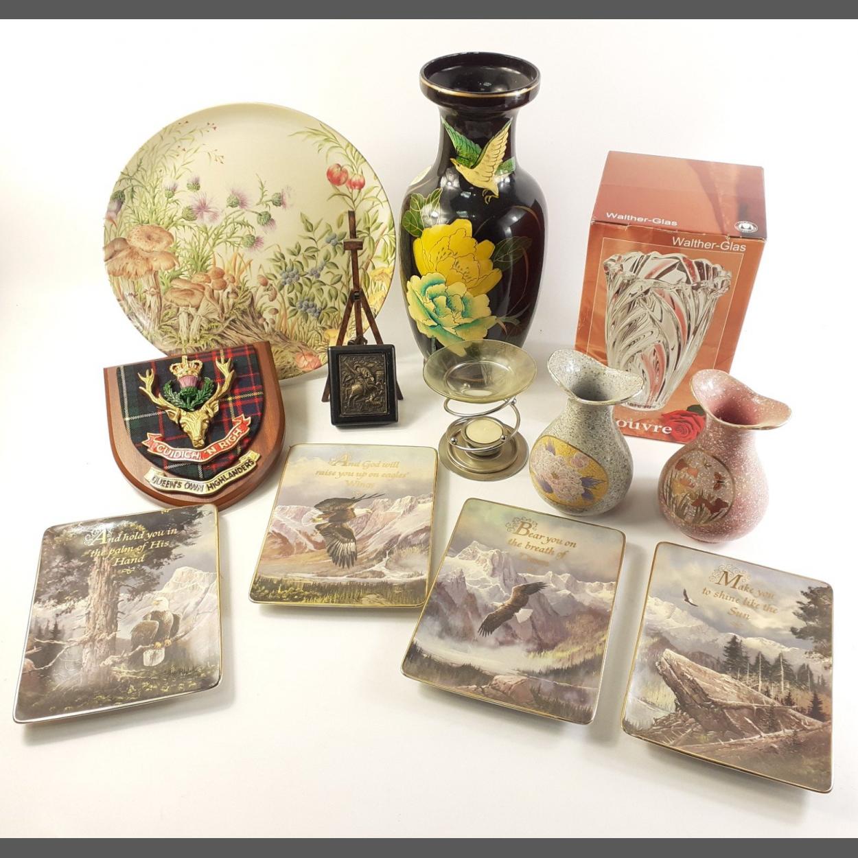 A mixed box to include a WALTER-GLAS vase, an Italian melamine tray, 2 pretty small stoneware vases, ceramic trays, decorative clan crest, candleholder,