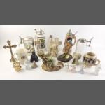 A small decorative lot to include 4 bier steins, small ornaments to include a Buddha, glass angel bells