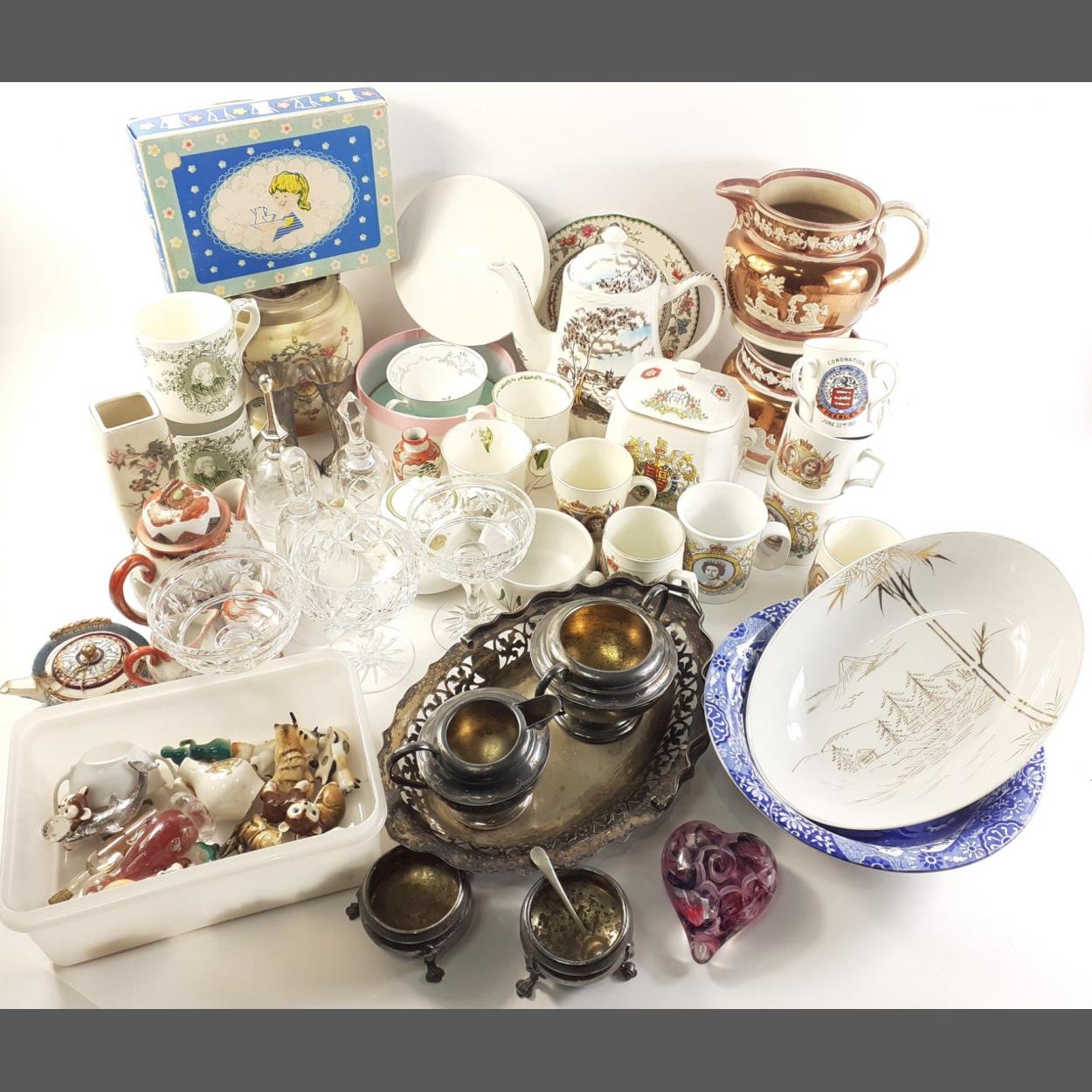 A mixed box to include a Grindley teapot, selection of small ceramic animals, vintage biscuit barrel, copper lustre vases, plates, and other assorted useful ceramics