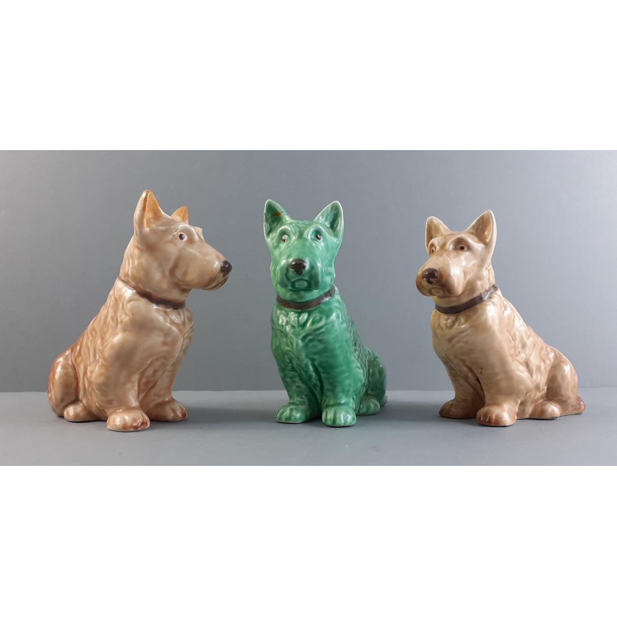 A collection of three cute little SYLVAC wire hair terriers. Model Number 1205. Standing 13cm tall. The green wire hair terrier has damage to his ear.