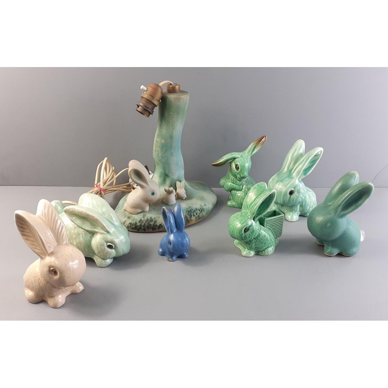 A collection of seven mainly SYLVAC bunny rabbits, tallest 13cm has chip from one ear, and blue rabbit has a damage repaired ear. Includes one DENBY rabbit and a table lamp approx 24cm high