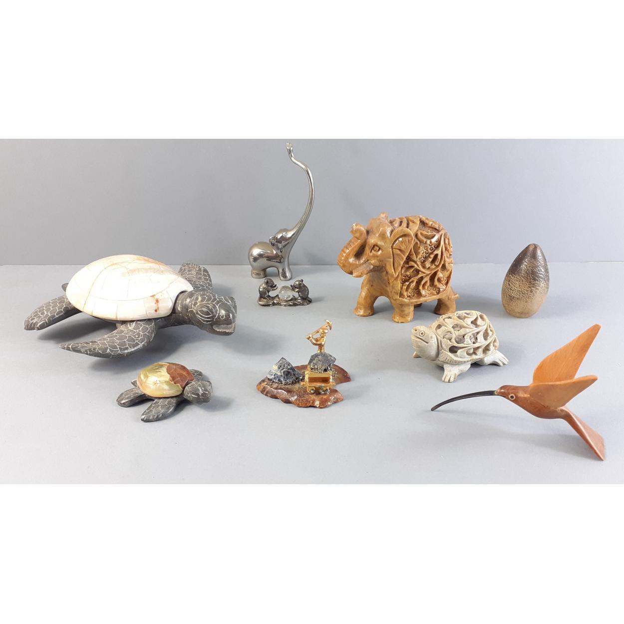 A small collection to include a stone model of a miner hewing rock (6cm long) also a collection of stone animals to include a turtle approx 17cm long, also a carved hummingbird (9cm long approx)