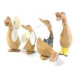 Five small wooden ducks by DCUK to include Herbie with the wellies (20cm approx), Ewan with tartan waistcoat, Herbie with no welly, Judith and one other