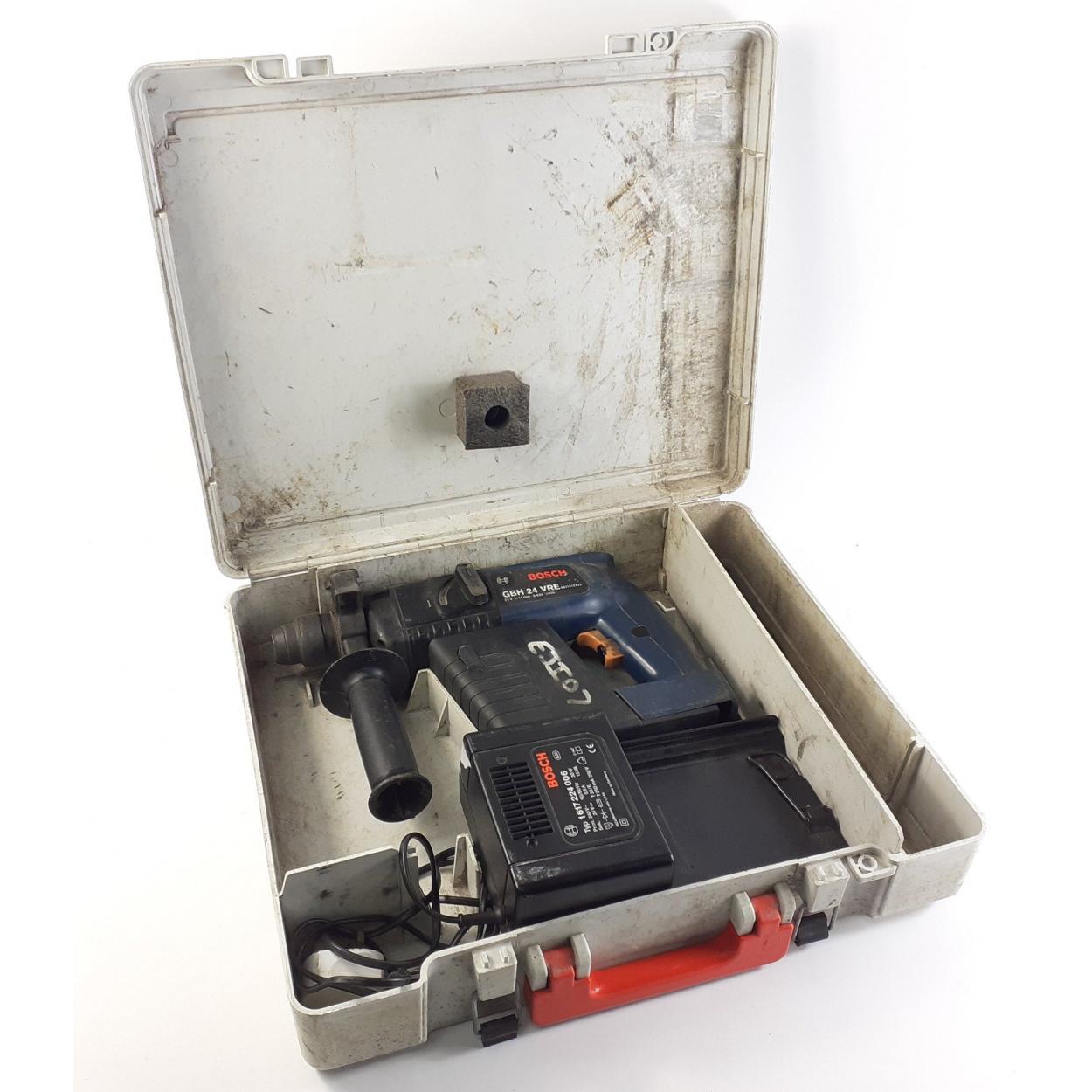 A used boxed Bosch GBH 24 VRE 24V hammer drill with battery charger.