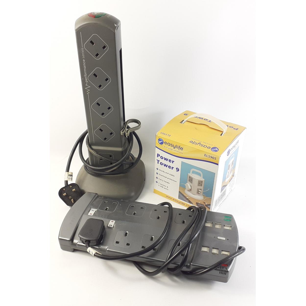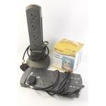 A box of tools containing a 4 way distribution box, worklight, helmets, hammers, saws and others.