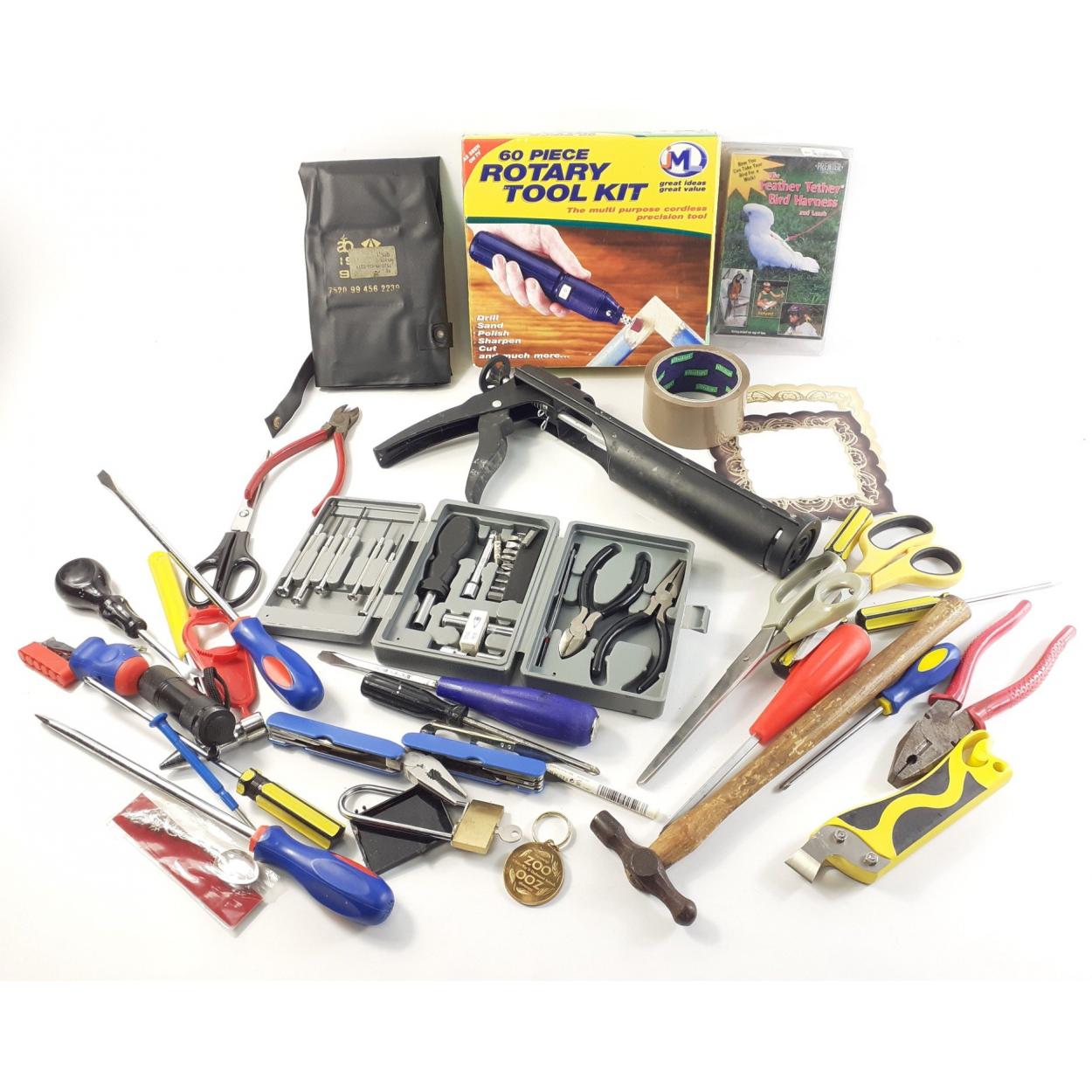 A bag FULL of mixed hand tools to include a silicon gun, a multi-tool set, a 60 piece rotary tool kit, a multi-folding box to contain pliers, fine screw drivers etc etc