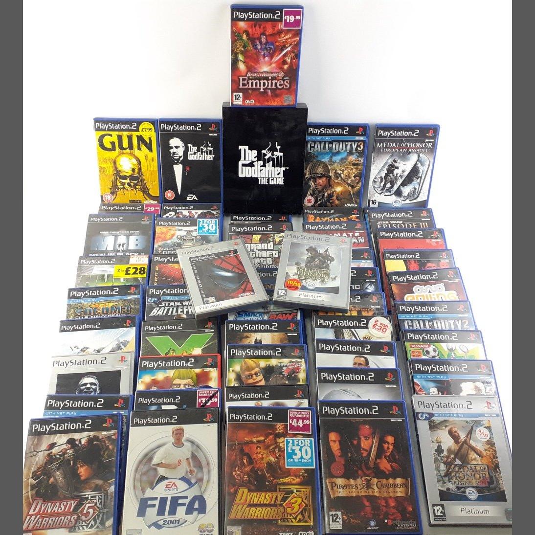 WOW ! A great selection of over forty SONY Playstation 2 games in cases. To include Bullworth Academy, RC Sports, Americas 10 Most Wanted, Eyetoy, Dynasty warriors 2, 3 & 5, Simpsons Hit and Run, Rayman 3, Medal of Honour, Call of Duty3, Godfather, Gu, Star Wars Battlefront, Squad, Men in Black II, Medal of Honour Rising Sun, Ultimate Spider Man, Desert Storm, Rolling, Grand Theft Auto, UEFA EURO 2004, Star Wars Episode 3, Call Of Duty 2, FIFAand much much else. All cased