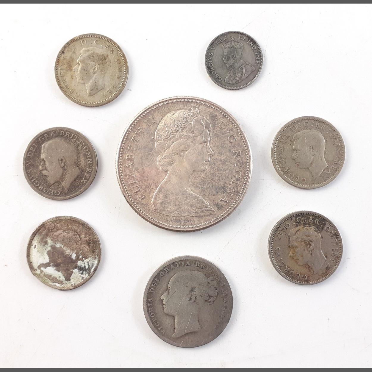 Small collection of silver coinage minimum 0.500 silver content. Includes 800 content 1967 Canada Dollar. Gross weight 42g approx.