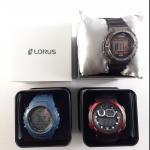 A small collection of three boxed digital quartz watches. Two RAVEL and a LORUS. All working.