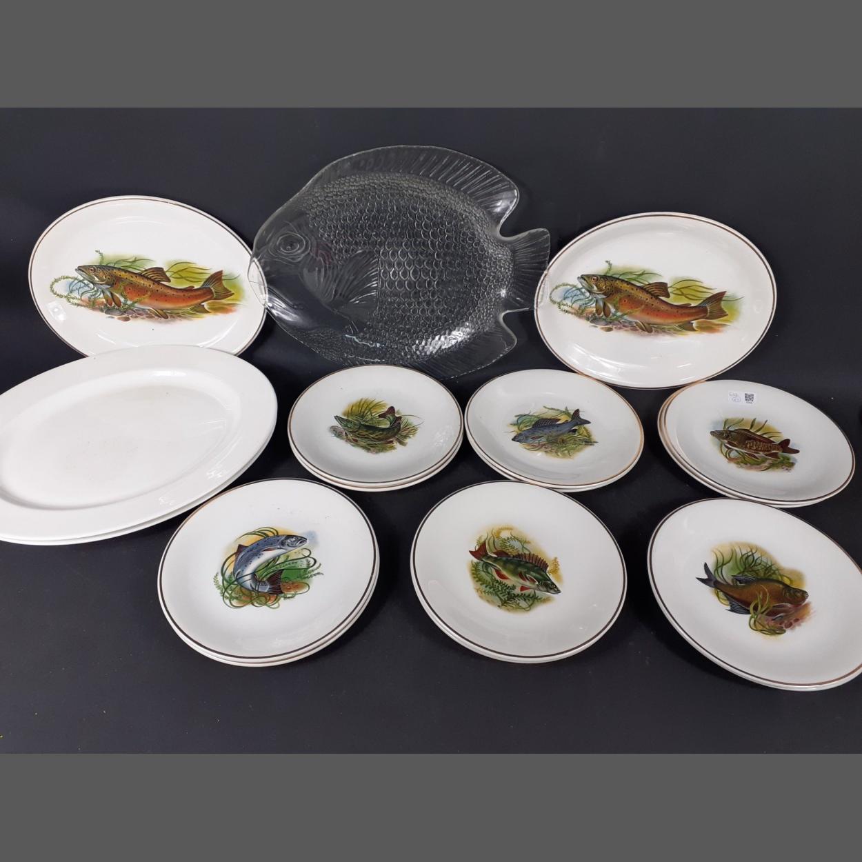 Something fishy going on - a set of 12 BARRATTS of STAFFORDSHIRE fish dishes (23cm dia) decorated with various river fish, plus 2 fish decorated platters (30cm long), a cut glass serving dish 39cm long and 2 white platters each 39cm long