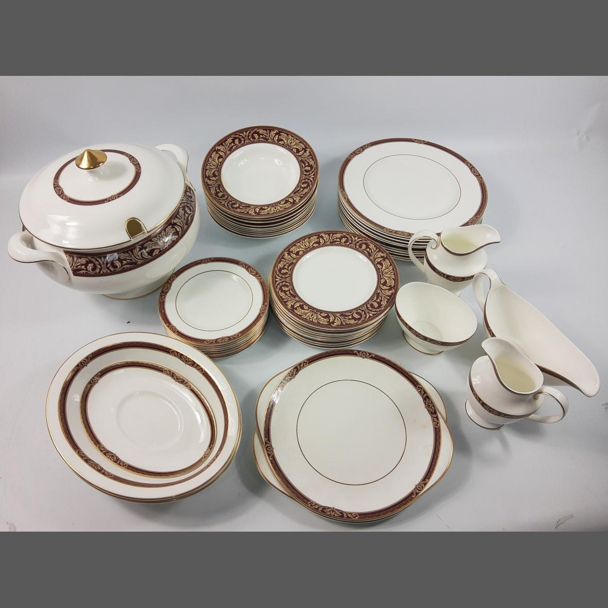 A ROYAL DOULTON dinner service in the TENNYSON pattern of white with a red and gilt edging comprising 8 plates (17cm), 10 plates (20cm), 10 plates (27cm), 10 bowls (20cm dia), 2 cake plates (24cm ), 1 sauceboat with underplate, 2 creamers, 1 sugar bowl, 2 oval serving dishes (27cm long), 1 tureen standing approx 25cm high